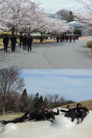オリエンテーション、身体測定終了後、近くのいわき公園へ出かけ、満開の桜を眺めながらお昼を食べました。