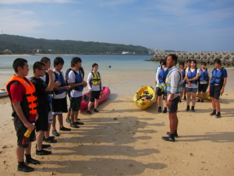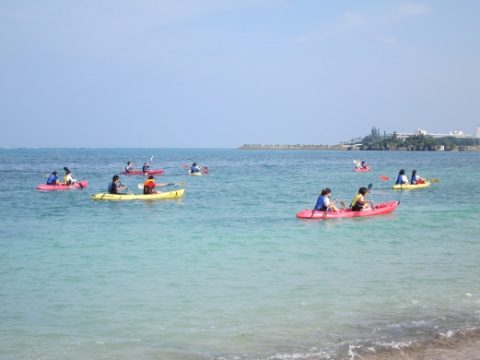 修学旅行2日目は、午前中、恩納村仲泊海岸へ向かい、シーカヤック体験をしました。