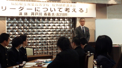 高校31回卒の井戸川寿義氏(日本能率協会マネジメントセンター人事部長)から、「リーダーについて考える」という演題で講演をしていただきました。生徒、教職員にとって、有意義なお話を拝聴できました。これから、芸術鑑賞「ライオンキング」です。